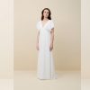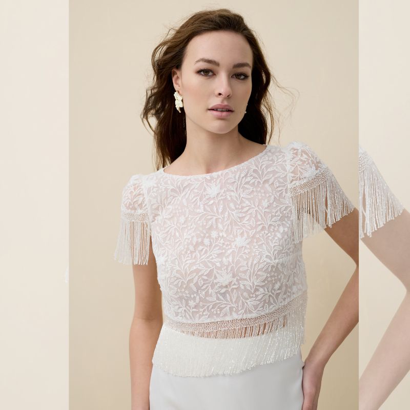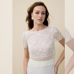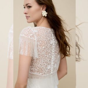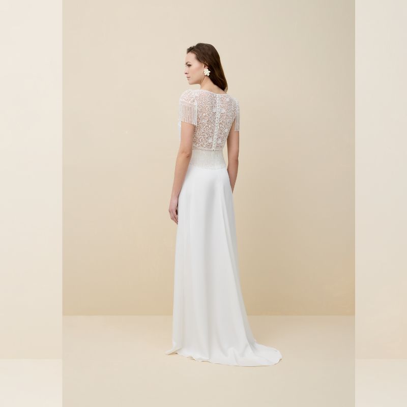 Magnolia is a stylish two-piece dress! The top is made of flower embroidery with beaded strips at the edges. It has a boatneck and short sleeves, while the back closes with buttons. The high-waisted skirt is made of satin and has a sweep train.